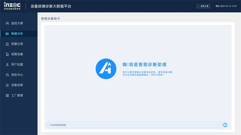在數(shù)據(jù)分析詳情頁中,用戶可直接向“智能診斷助手”提出問題(如“齒輪箱磨損要點(diǎn)關(guān)注設(shè)備哪些狀態(tài)指標(biāo)?”),系統(tǒng)實(shí)時(shí)解析設(shè)備運(yùn)維專 業(yè)問題并生成結(jié)論。