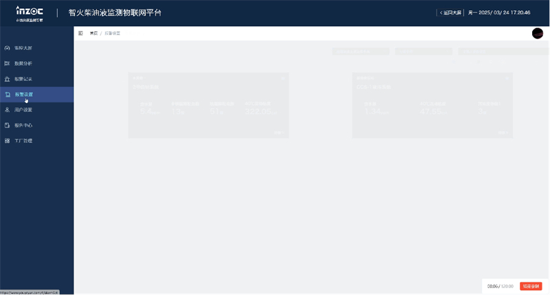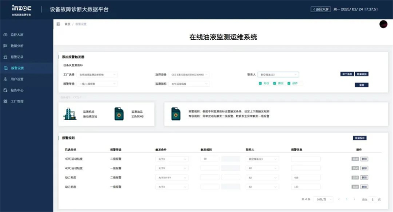 ■ 警報(bào)記錄與設(shè)置:在報(bào) 警記錄模塊可以查看設(shè)備歷史報(bào) 警信息。進(jìn)入報(bào) 警設(shè)置頁面可以根據(jù)不同監(jiān)測(cè)指標(biāo)設(shè)置觸發(fā)條件,設(shè)定上下限觸發(fā)規(guī)則,異常波動(dòng)先觸發(fā)二級(jí)報(bào) 警、數(shù)據(jù)發(fā)生異常觸發(fā)一級(jí)報(bào) 警,支持微信、信息、郵件等多通道預(yù)警。