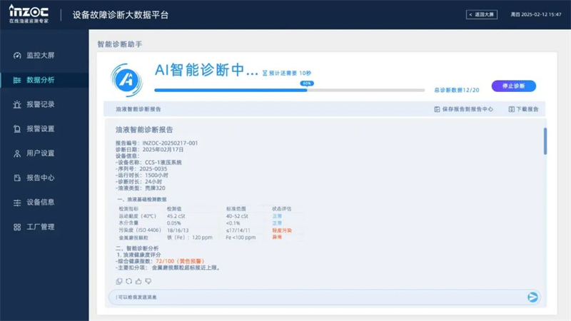 ● 診斷報(bào)告:基于AI模型與專家經(jīng)驗(yàn)雙引擎,遠(yuǎn)程分析油液狀態(tài)并生成科學(xué)診斷結(jié)論(如磨損類型、污染等級(jí)),報(bào)告附帶維護(hù)優(yōu)先級(jí)建議,助力準(zhǔn)確決策。