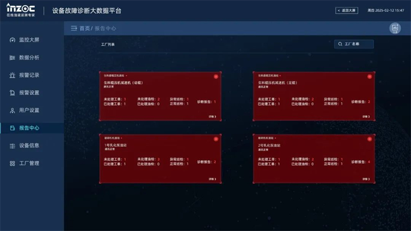 報(bào)告中 心 一級(jí)界面可總體預(yù)覽設(shè)備狀態(tài),二級(jí)界面深入結(jié)合工單記錄、油檢報(bào)告、巡檢報(bào)告、診斷報(bào)告四大核心模塊,構(gòu)建設(shè)備運(yùn)維全流程閉環(huán)管理體系。