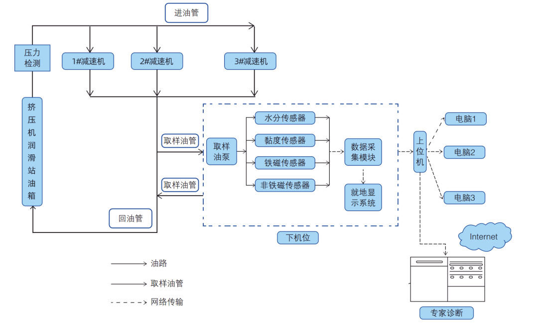 ▲擠壓機(jī)潤(rùn)滑系統(tǒng)的油液在線(xiàn)監(jiān)測(cè)系統(tǒng)原理