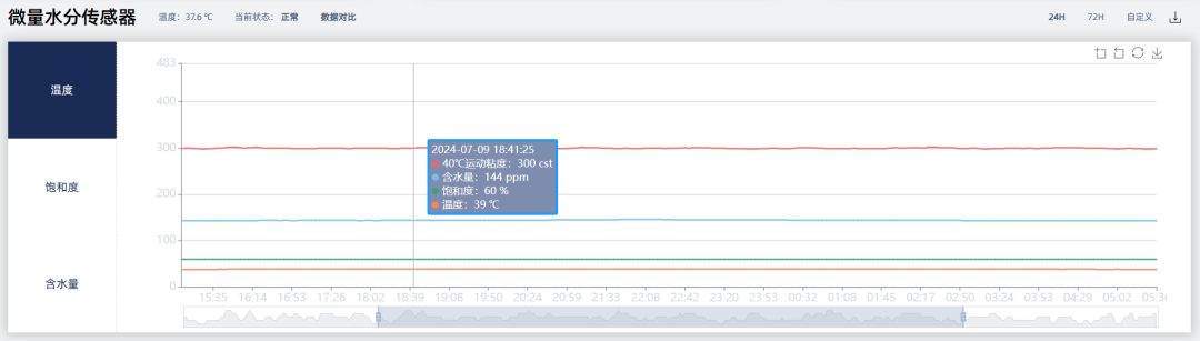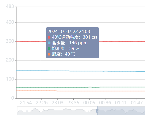 通過(guò)人機(jī)界面可以直觀查詢(xún)?nèi)?0 ℃黏度、實(shí)時(shí)黏度、油溫、水分、鐵磁顆粒、非鐵磁顆粒等數(shù)據(jù)的歷史曲線(xiàn)。