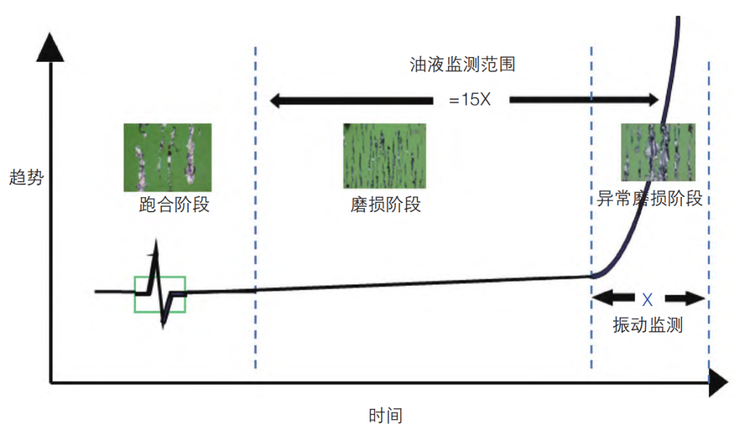 如上圖所示,“X”標(biāo)記了振動(dòng)監(jiān)測(cè)傳感器發(fā)現(xiàn)設(shè)備磨損的時(shí)間點(diǎn),而油液監(jiān)測(cè)系統(tǒng)則能在該時(shí)間點(diǎn)之前約15倍的時(shí)間段內(nèi)提前預(yù)警,表明油液監(jiān)測(cè)在捕捉設(shè)備內(nèi)部早期磨損變化上更為靈敏和有 效。