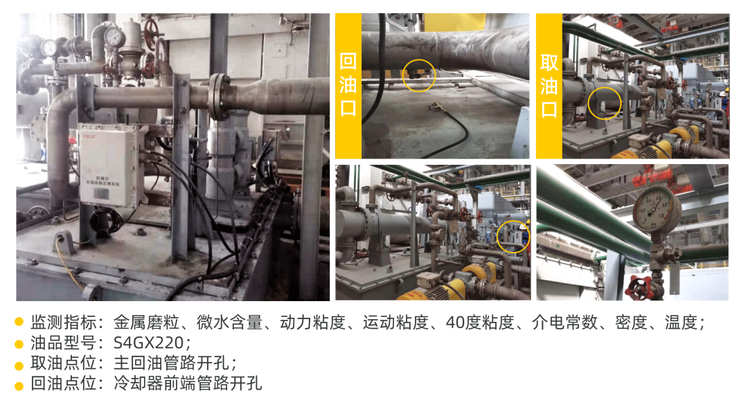 監(jiān)測(cè)裝置采用支架安裝,選取擠壓機(jī)潤(rùn)滑站的主回油管路開(kāi)孔,作為監(jiān)測(cè)油液系統(tǒng)的油液取樣口,同時(shí)也在冷卻器前端管路開(kāi)孔,形成一條回油支路,形成閉環(huán)整個(gè)油路系統(tǒng),實(shí)現(xiàn)24h無(wú)間斷的油液采集監(jiān)測(cè)。